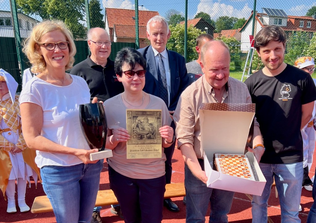 Schönes Wetter, beste Pausenversorgung und Lebendschach auf dem großen Schachfeld rundeten die Veranstaltung ab. Das Präsidium des LSV war ebenfalls mit einer Mannschaft vertreten, für die Gedeon Hartge, Tatjana Melamed, Roland Katz und Claudia Meffert antraten. Am Ende konnte sich die Mannschaft des Präsidiums knapp durchsetzen und gewann vor Berlin-Giesensdorf und Kamp-Lintfort den Pokal und die traditionelle Schachtorte. Herzlichen Glückwunsch!