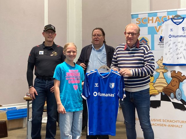 Zurück zum Turnierhöhepunkt: Die Versteigerung wurde nach amerikanischer Art veranstaltet und Turnierleiter Jens Windelband mit einem Spendenglas ausgestattet. Wenn er gewusst hätte, was in den nächsten Minuten auf ihn zukam, hätte er es bestimmt delegiert. Und so rannte er – bald schweiß-überströmt – vor und zurück, kreuz und quer, mal linksrum, mal rechtsrum durch den Turniersaal und sammelte 331 EUR an Spenden für ein regionales inklusives Projekt ein. Das Geld erhalten die Bogenschützen vom Bierer Berg, die Bogen schießen auch für Menschen mit Beeinträchtigungen möglich machen wollen. Nachfolgend wurde das signierte Schachbrett für 50 EUR versteigert und das zweite FCM-Trikot brachte nochmal 50 EUR ein. Mit einer abschließenden Spende, um die Sache rund zu machen, wurde die großartige Spendensumme von 450 EUR zusammengetragen. Sehr zur Freude von Herrn Scheunemann, der die Spende direkt in Empfang nahm und den Teilnehmern seinen Dank aussprach.