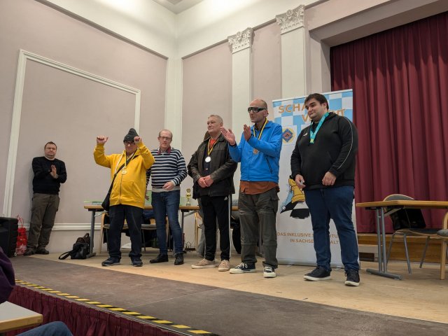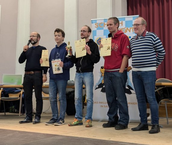 Das Gesamtturnier gewannen Florian Armbrust und Jakob Nönnig (beide Aufbau Elbe Magdeburg) vor Karsten Zamzow (Magdeburg). Jakob führte nach 6 Runden bereits mit einem Punkt Vorsprung, unterlag Florian aber im direkten Duell. Punkt- und buchholzgleich musste die Drittwertung über die Pokalvergabe entscheiden. Jakob erhielt als Zweiter ein handsigniertes Buch von Phil Hubbe, dem Zeichner von Behinderten-Cartoons und dem Gestalter der Logos des Inklusiven Schachturniers.