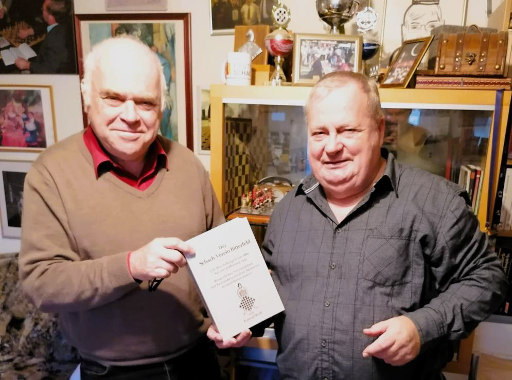 Konrad Reiß überreicht sein aktuelles Buch „Der Schach-Verein Bitterfeld - Von den Anfängen um 1880 bis zur Auflösung 1945 - Bürgerliches Vereinsleben mit bewundernswerten Akteuren in unsicheren Zeiten“. Zum Service des Schachmuseums Löberitz gehört es: An bedeutende Menschen wird das Buch noch persönlich angeliefert und überreicht.