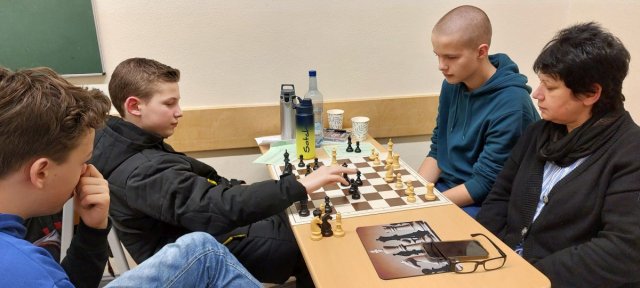 Kurioserweise gab es auch in der 4. Runde wieder das Endspiel Turm und Springer gegen Turm, das eigentlich theoretisch Remis ist. Diesmal war jedoch Valentin Udelnov der Unglückliche. Er machte im 80. Zug einen vermeintlichen Fehlgriff und sah plötzlich ein undeckbares Matt, was aber keines war. Erschrocken gab er auf und verschaffte somit Aaron Gröbel einen vollen Punkt. Aaron ist damit in der 5. Runde der Gegner des aktuellen Spitzenreiter Daniel Lippert.