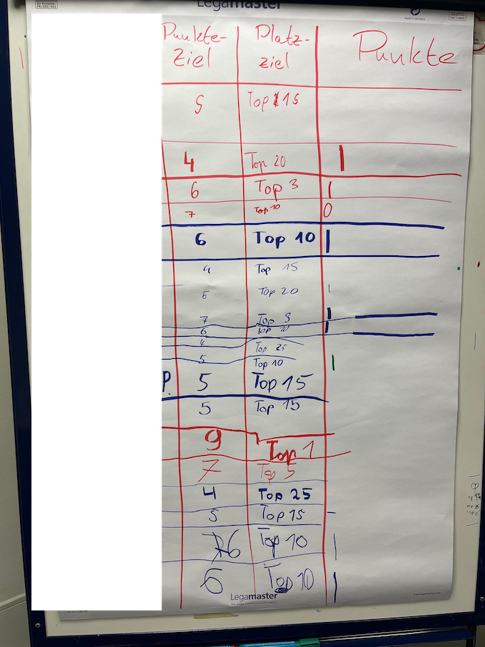 Ein Ritual, das motiviert: Jede Spielerin und jeder Spieler verewigte das persönliche Turnierziel auf einer Flipchart. Vom Ziel Deutscher Meister zu werden bis unter den ersten 25 zu landen, war alles dabei.